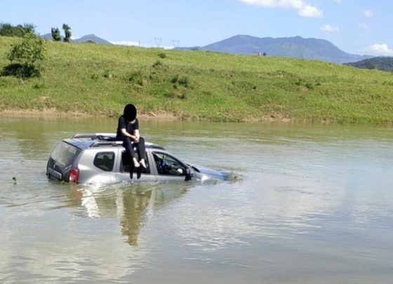 Jovem sentou no teto de carro após queda no rio em Brusque; veja momento do resgate