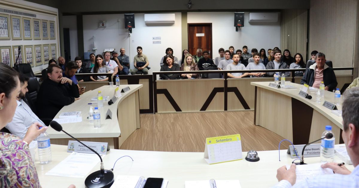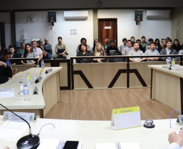 Participaram da sessão também os estudantes do 1º e 2º ano do Ensino Médio, acompanhados pelas professoras Deise Jorge Pavesi e Stéffani Merisio Martins.