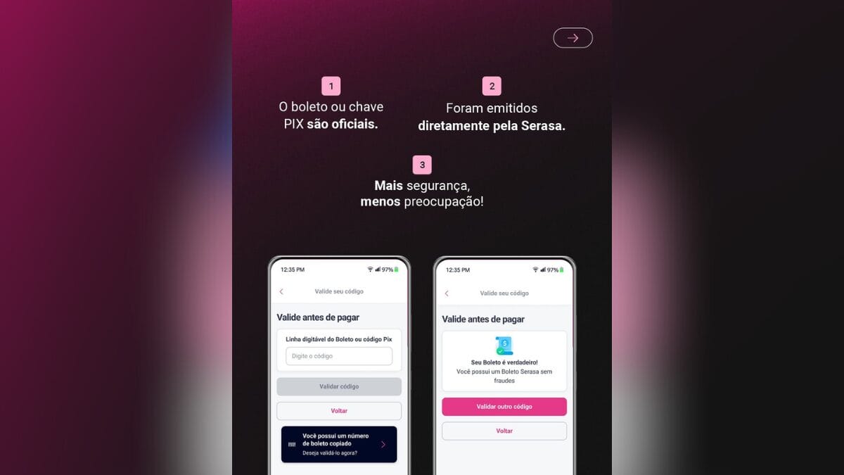 Evite pagar boletos que você tenha recebido por email, Whatsapp ou SMS, sem que você tenha solicitado a negociação nos canais oficiais do Serasa. O site deles também oferece um validador de boletos para verificar a autenticidade.