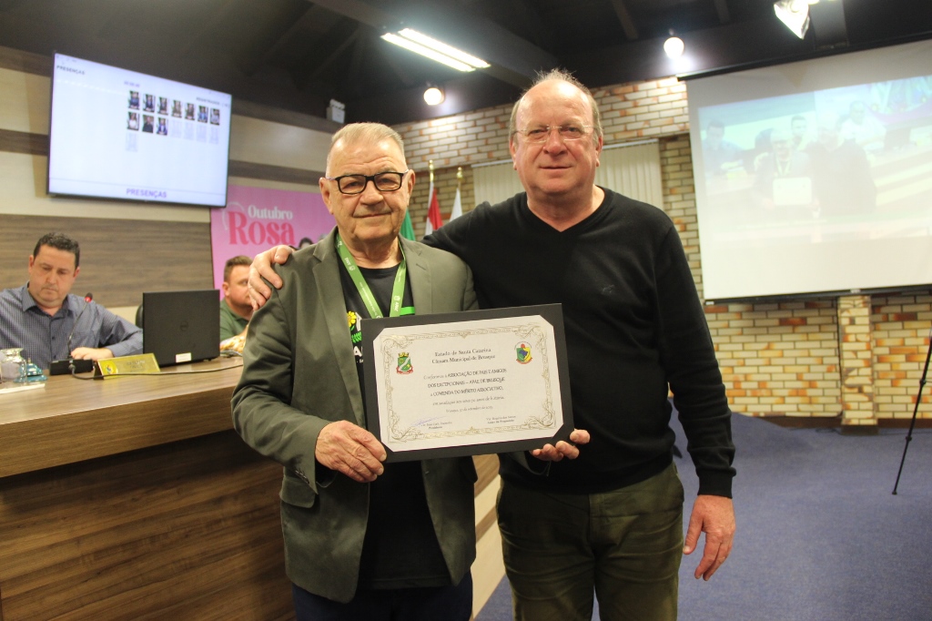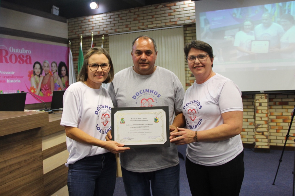 Durante a sessão, foram entregues também comendas para a Associação de Pais e Amigos dos Excepcionais (Apae), Docinhos Solidários de Brusque e para o cartunista Aldo Maes dos Anjos, da revista Cartum.
