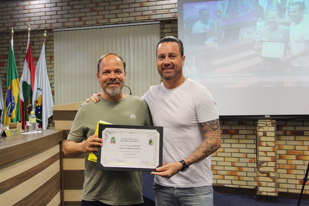 “Temos certeza que Brusque está bem representada. Levarei esta homenagem, esta surpresa, em meu coração. Agradeço a cada vereador pelo reconhecimento”.