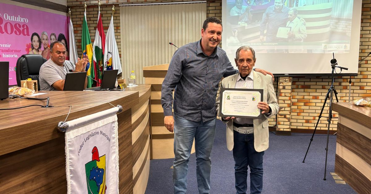 Além da homenagem do Legislativo, Aurinho recebeu uma comenda da Prefeitura de Brusque. Na placa, constam os nomes de todos os prefeitos que trabalhou.