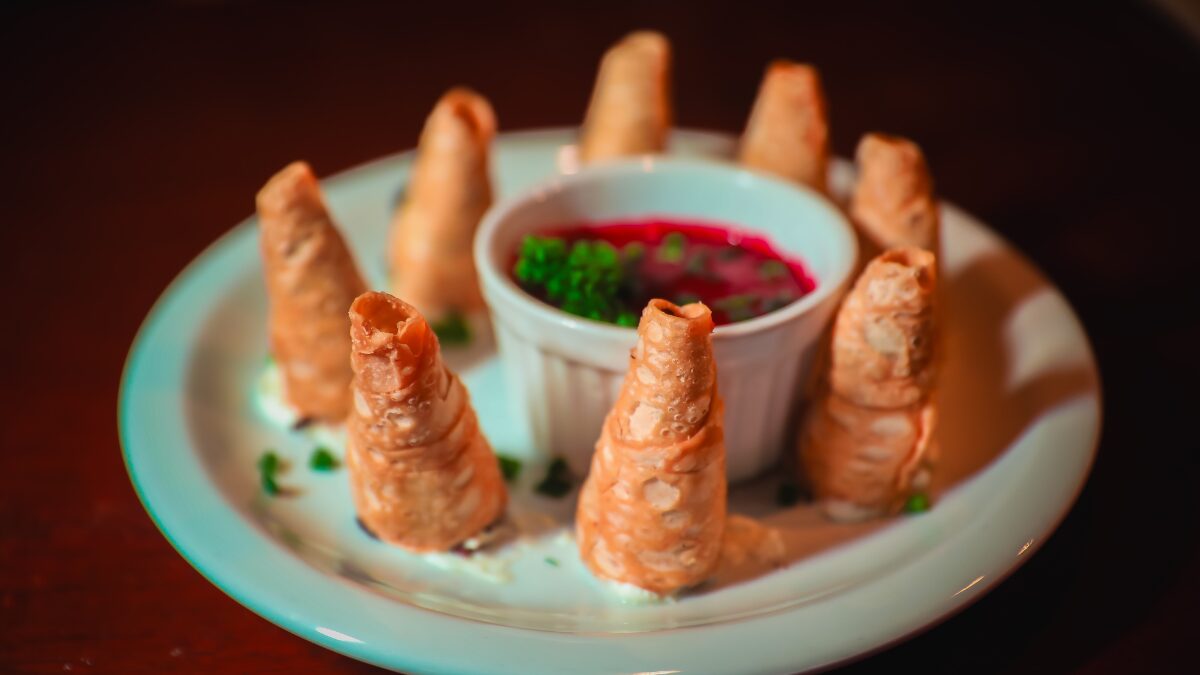 - Descrição do prato: Canudos recheados com cream cheese e polvo crocante ao alho. Acompanha vinagrete de frutas vermelhas