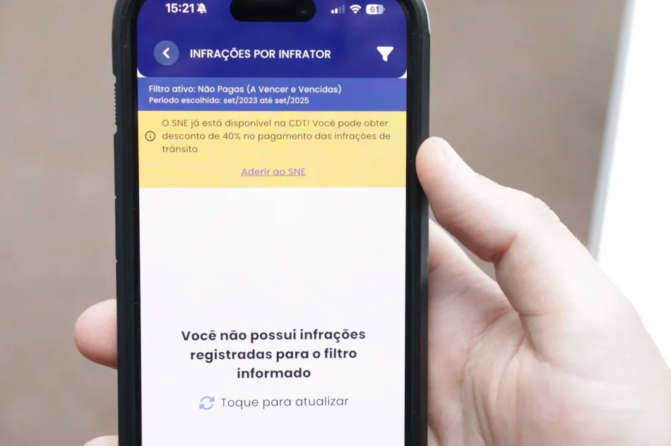 A adesão ao sistema é simples e pode ser feita diretamente no aplicativo da Carteira Digital de Trânsito: basta cadastrar o veículo e aceitar os termos do serviço. O cadastro é permitido para pessoas físicas e jurídicas proprietárias de veículos. Quem não possui Carteira Nacional de Habilitação (CNH) também pode aderir ao SNE utilizando o número de Registro Nacional de Veículo Automotores (Renavam).
