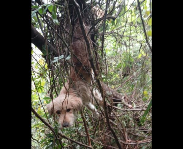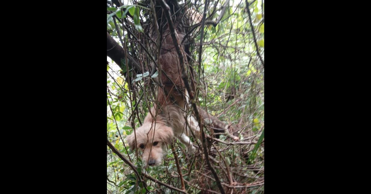 Uma cachorra foi resgatada após ser encontrada pendurada e enrolada em cipós em área de mata no bairro Steffen, em Brusque. O resgate aconteceu na tarde desta quarta-feira, 20.