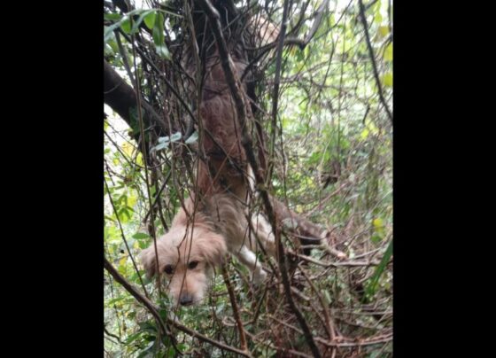 Uma cachorra foi resgatada após ser encontrada pendurada e enrolada em cipós em área de mata no bairro Steffen, em…