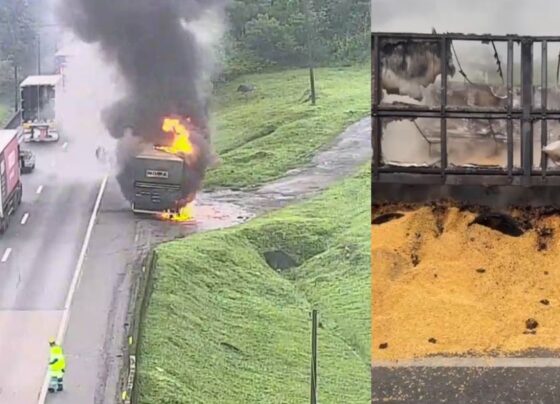 Carreta com carga de grãos de milho pega fogo na BR-376, entre SC e PR