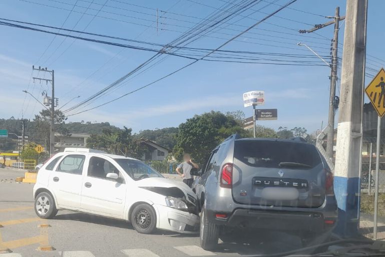 Um acidente de trânsito envolvendo três carros causou lentidão no cruzamento entre as ruas dos Imigrantes e Nicolau Schaefer, no bairro Guabiruba Sul, em Guabiruba, no início da tarde deste sábado, 2.