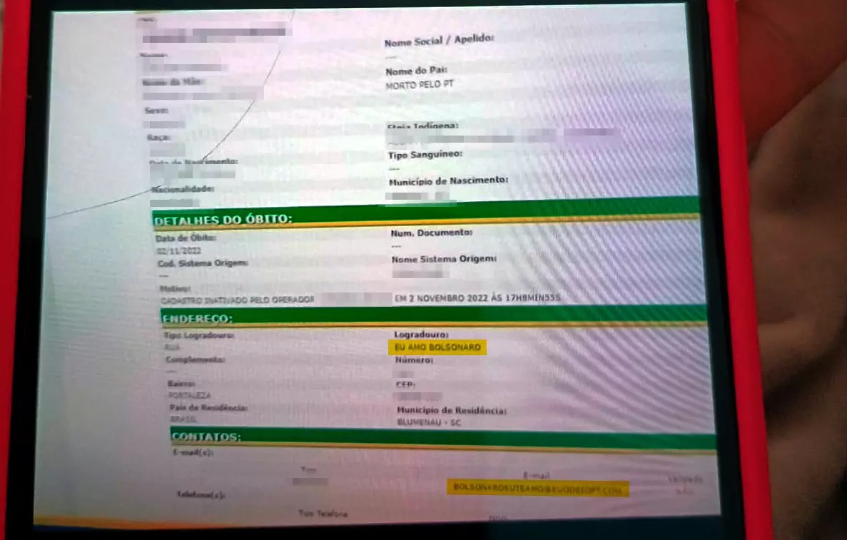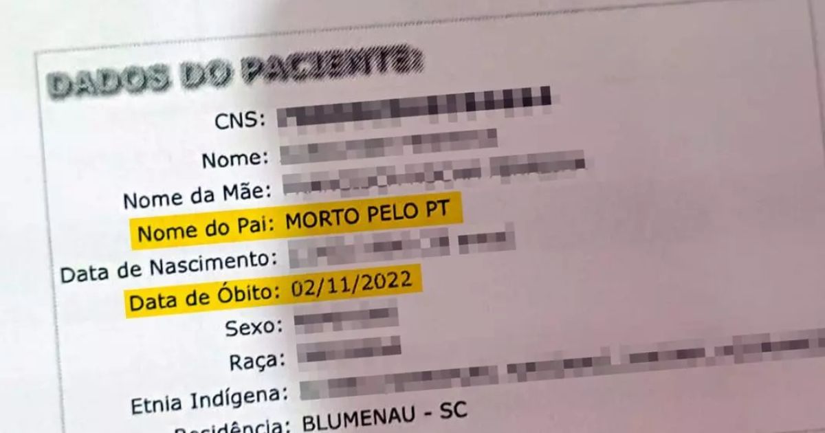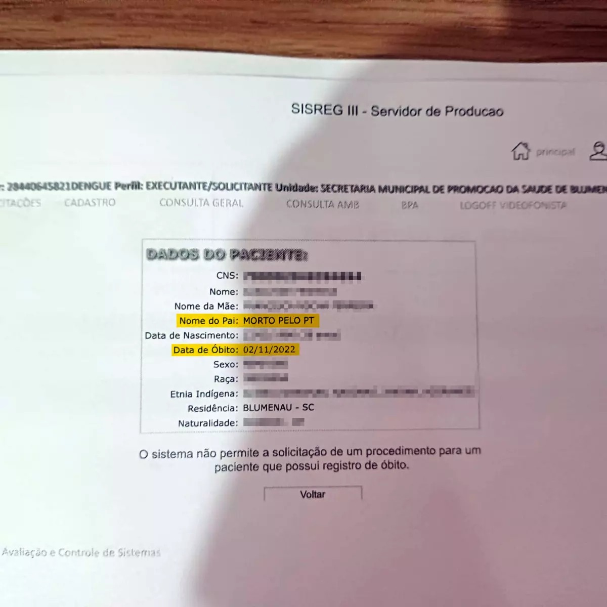 Ela constava como morta neste sistema desde o dia 2 de novembro de 2022. A paciente descobriu isso após ir até o Centro de Atendimento da Dengue, em Blumenau, na Furb. Em uma das situações mais graves, o nome de seu pai foi alterado para “Morto pelo PT”. O pai da paciente faleceu no Rio Grande do Norte em 2017.