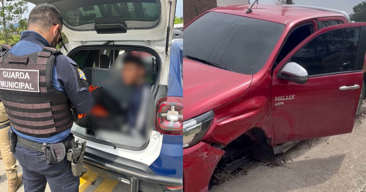 Durante a fuga, na rua Itajaí, o condutor da caminhonete perdeu o controle da direção e colidiu contra uma BMW que estava estacionada. O impacto causou a perda de uma das rodas da Hilux. Ainda assim, o veículo percorreu cerca de 200 metros antes de parar completamente.