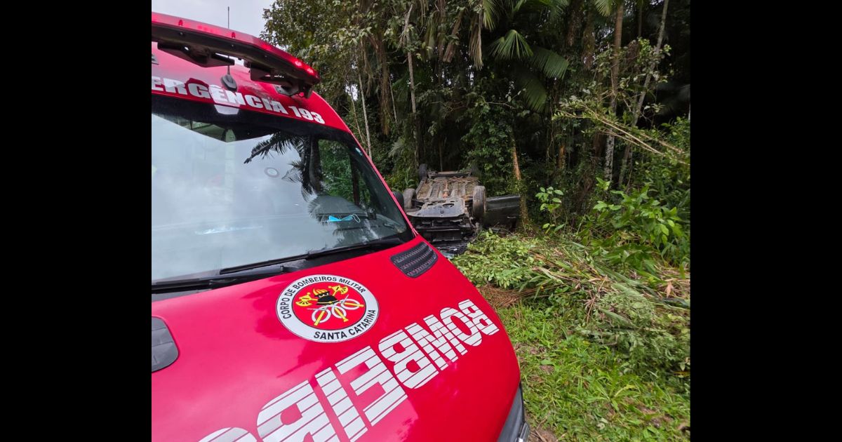 Um homem ficou ferido após sair da pista e capotar o carro na rua Cristiano Albrecht, no bairro Holstein, em Guabiruba, na tarde deste domingo, 27.