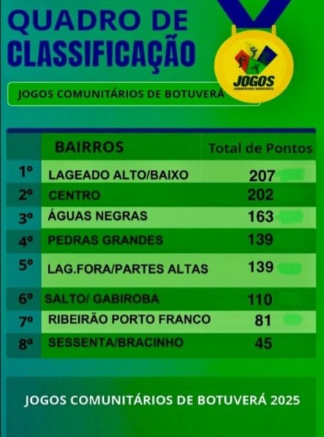 Na classificação geral dos Jogos, Lageado Alto/Baixo assegurou o primeiro lugar, seguido pelo Centro na segunda colocação, e por Águas Negras, que finalizou em terceiro.