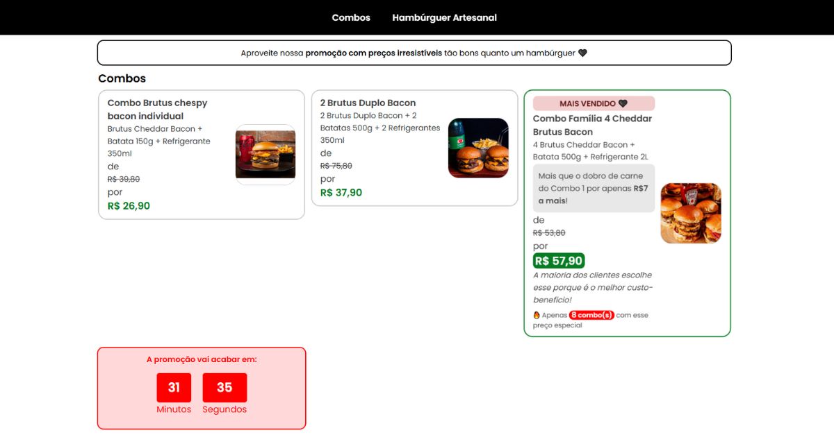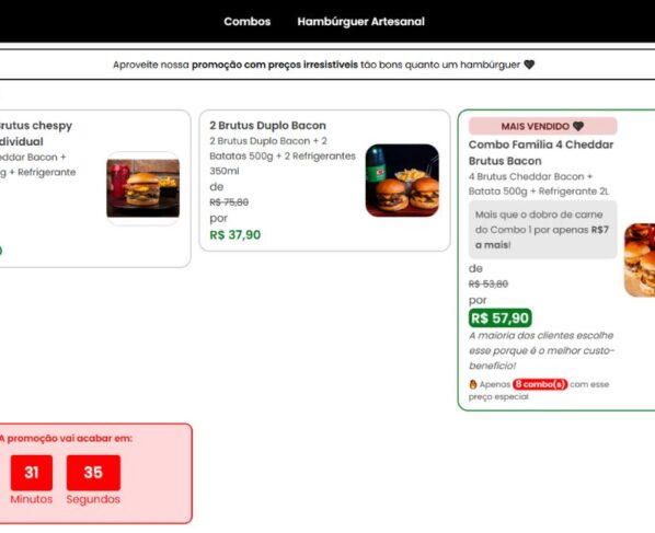 O combo família aparece em promoção por tempo limitado, com um contador. Na primeira vez que a reportagem acessou o site ele indicava dez minutos, já na segunda, trinta.