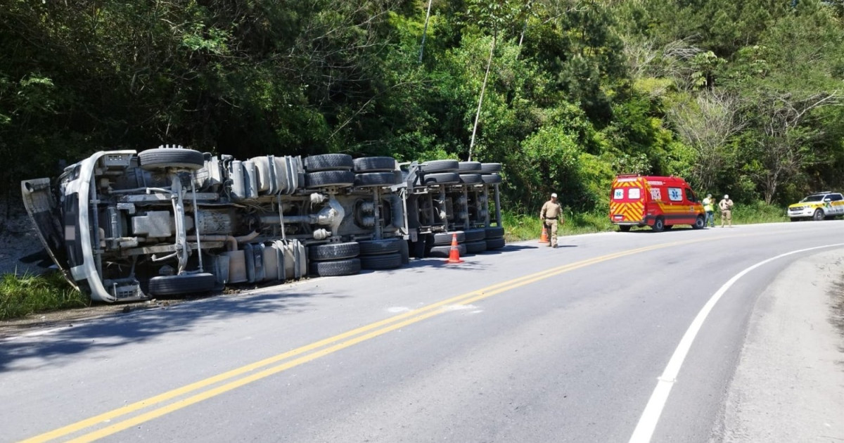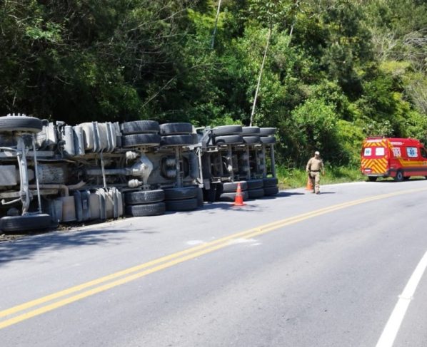 Um motorista de 30 anos ficou ferido após o tombamento de uma carreta na rodovia Pedro Merizio, no bairro Pedras Grandes, em Botuverá, na manhã desta segunda-feira, 13. O acidente ocorreu por volta das 8h20 e mobilizou o Corpo de Bombeiros, a Polícia Militar e a Polícia Militar Rodoviária (PMRv).