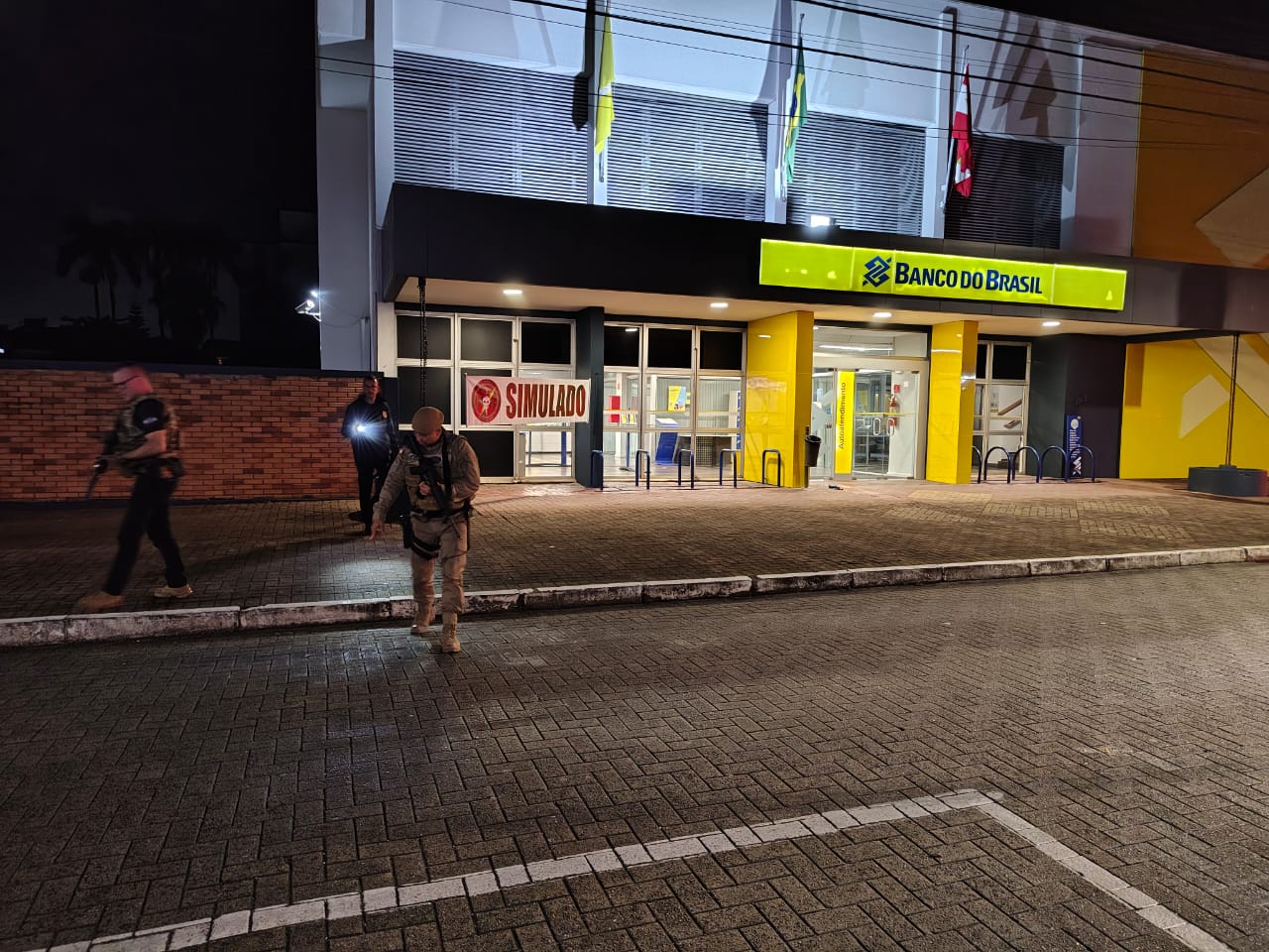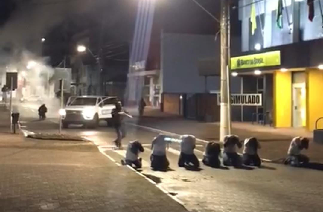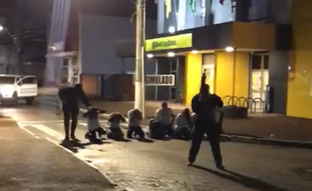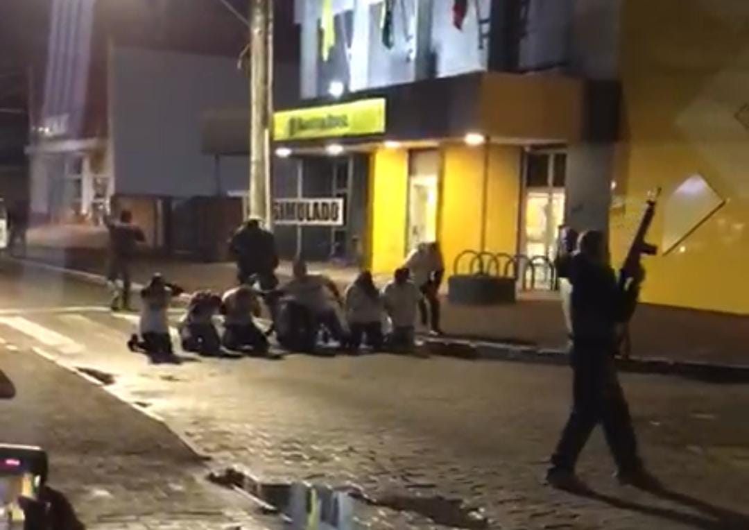 O “assalto” começou pouco depois das 2h, quando os criminosos chegaram de camionete em uma agência do Banco do Brasil no Centro de Gaspar. Armados e encapuzados, eles fizeram clientes de reféns e os colocaram ajoelhados no meio da rua, como mostram as imagens abaixo.