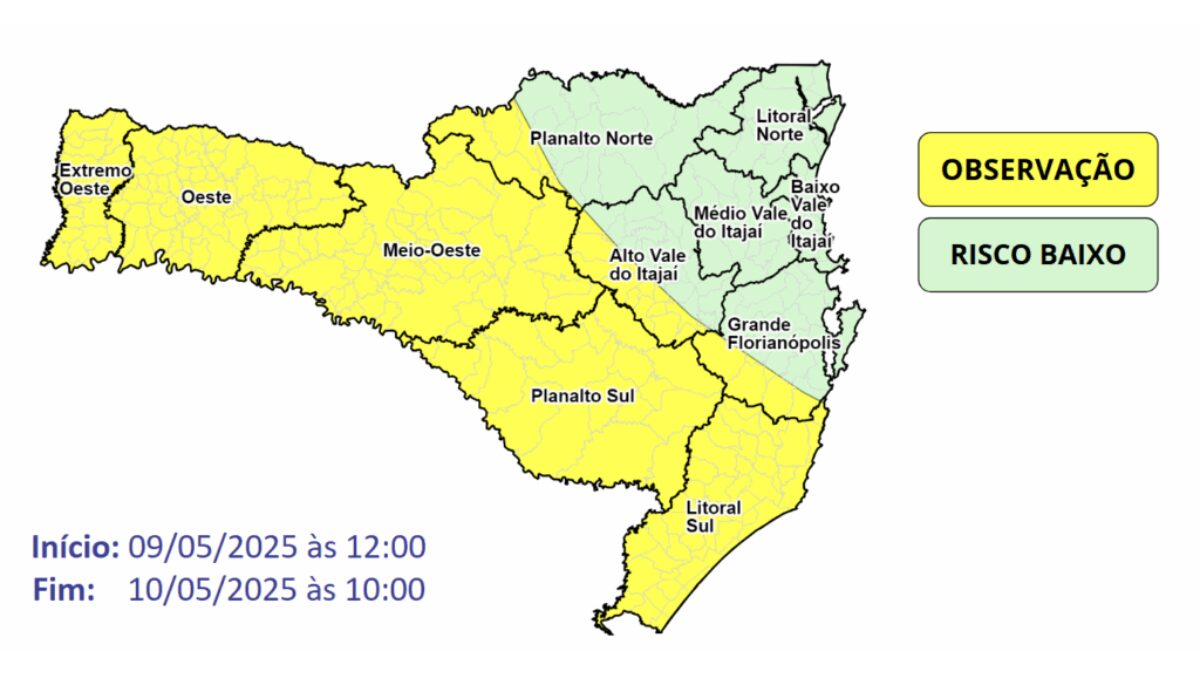 De acordo com a Defesa Civil, entre esta sexta-feira (9) e o sábado (10), a passagem de uma frente fria volta a favorecer temporais acompanhados de chuva intensa e vendaval em boa parte de Santa Catarina. Este temporais trazem risco moderado a alto em regiões como o Oeste, região Serrana, Sul, Alto Vale do Itajaí, Planalto Norte e Grande Florianópolis.