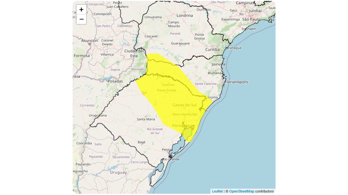 O Oeste catarinense, a região Serrana e parte do Sul de Santa Catarina estão dentro do alerta amarelo de “perigo potencial” do Instituto Nacional de Meteorologia (Inmet). O aviso do Inmet sinaliza possíveis acúmulos de chuva entre esta quinta (8) e sexta-feira (9). As chuvas podem variar entre 20 e 30 mm/h ou até 50 mm/dia, ventos intensos (40-60 km/h), e queda de granizo, segundo o órgão.