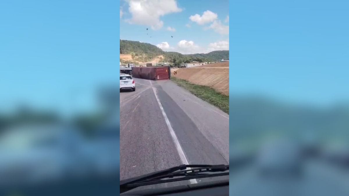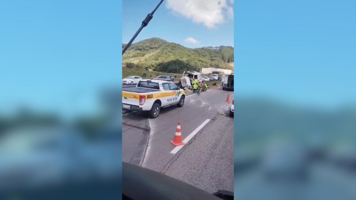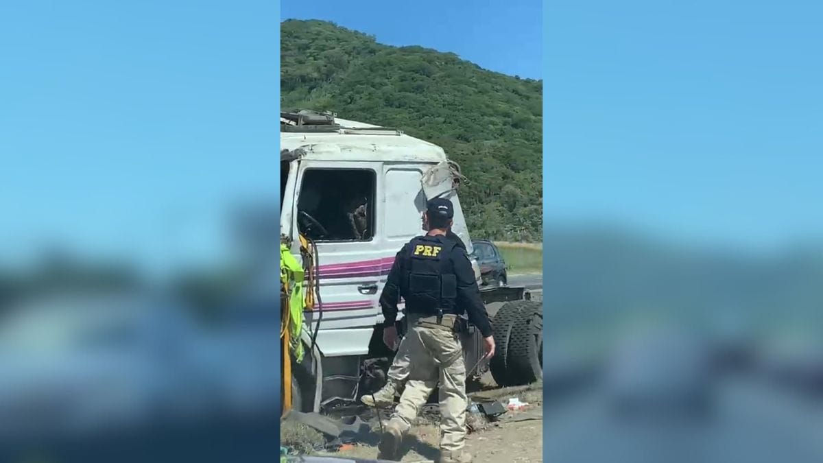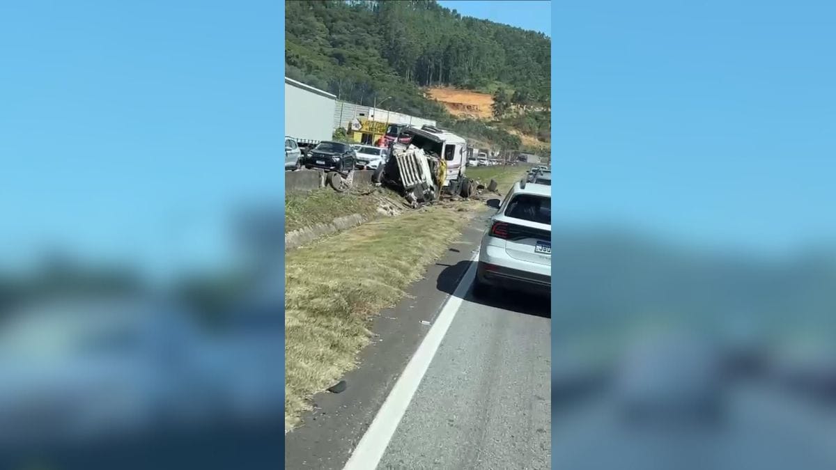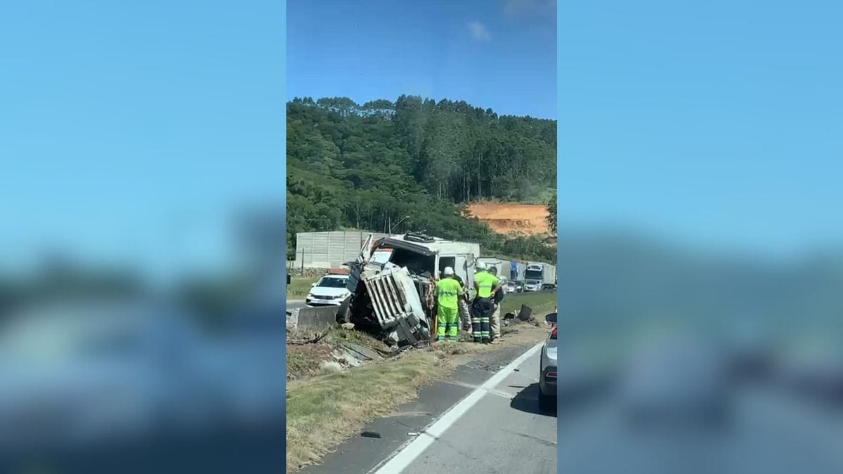 Imagens mostram que a cabine do caminhão bateu na estrutura de concreto que separa os dois sentidos da rodovia. Já a parte traseira ficou caída de lado bloqueando a faixa da direita e o acostamento. A Polícia Rodoviária Federal não informou o que provocou o acidente.