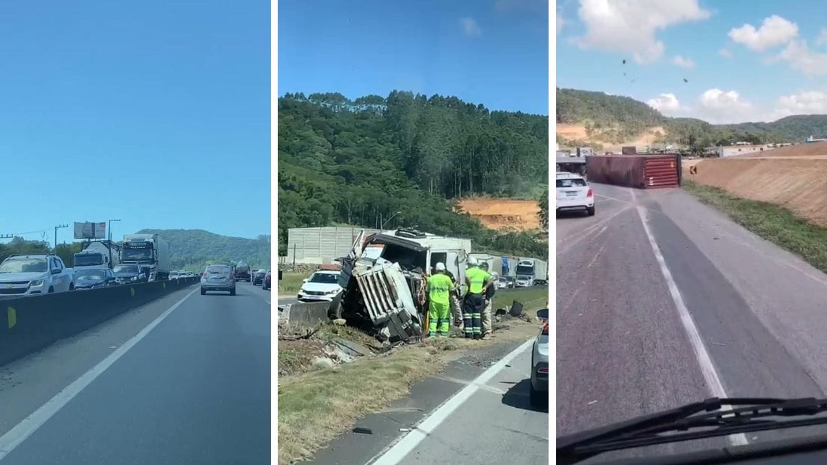 Um acidente no começo da tarde deste domingo (30) complicou o trânsito na BR-101, em Penha, no Litoral Norte de Santa Catarina. Uma parte de uma carreta tombou na altura do quilômetro 109, sentido a Porto Alegre, deixando o motorista gravemente ferido e provocando longas filas.