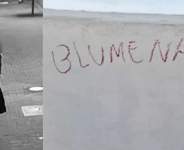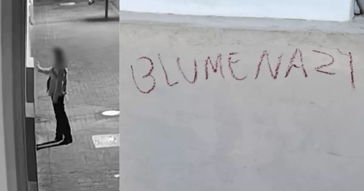 Nas imagens, é possível ver que a mulher chega sozinha ao local e, com um objeto pequeno, o qual não é possível identificá-lo, escreve frases como “Blumenazi” e “Velho da Havan é fascista” na parede do estabelecimento.